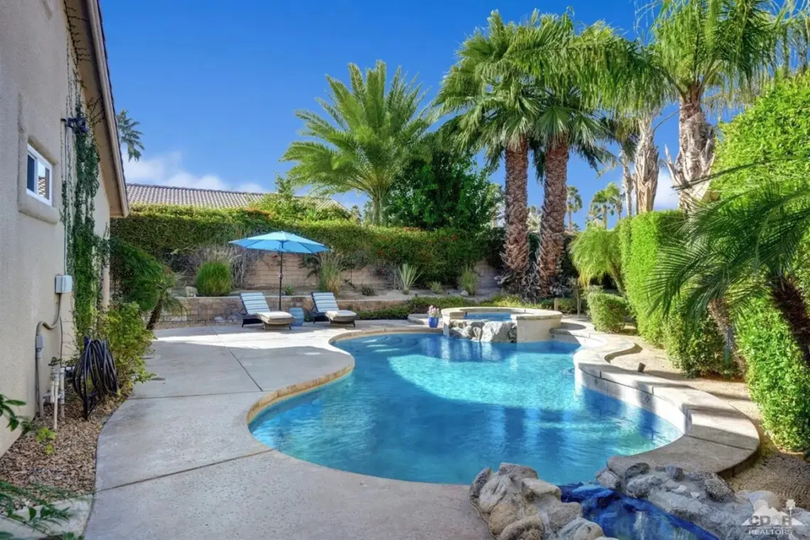 The courtyard boasts a serene pool area with a tranquil waterfall and stream, leading you further into this desert paradise. Dive into the refreshing waters or unwind in the hot tub as you immerse yourself in the ultimate relaxation experience.